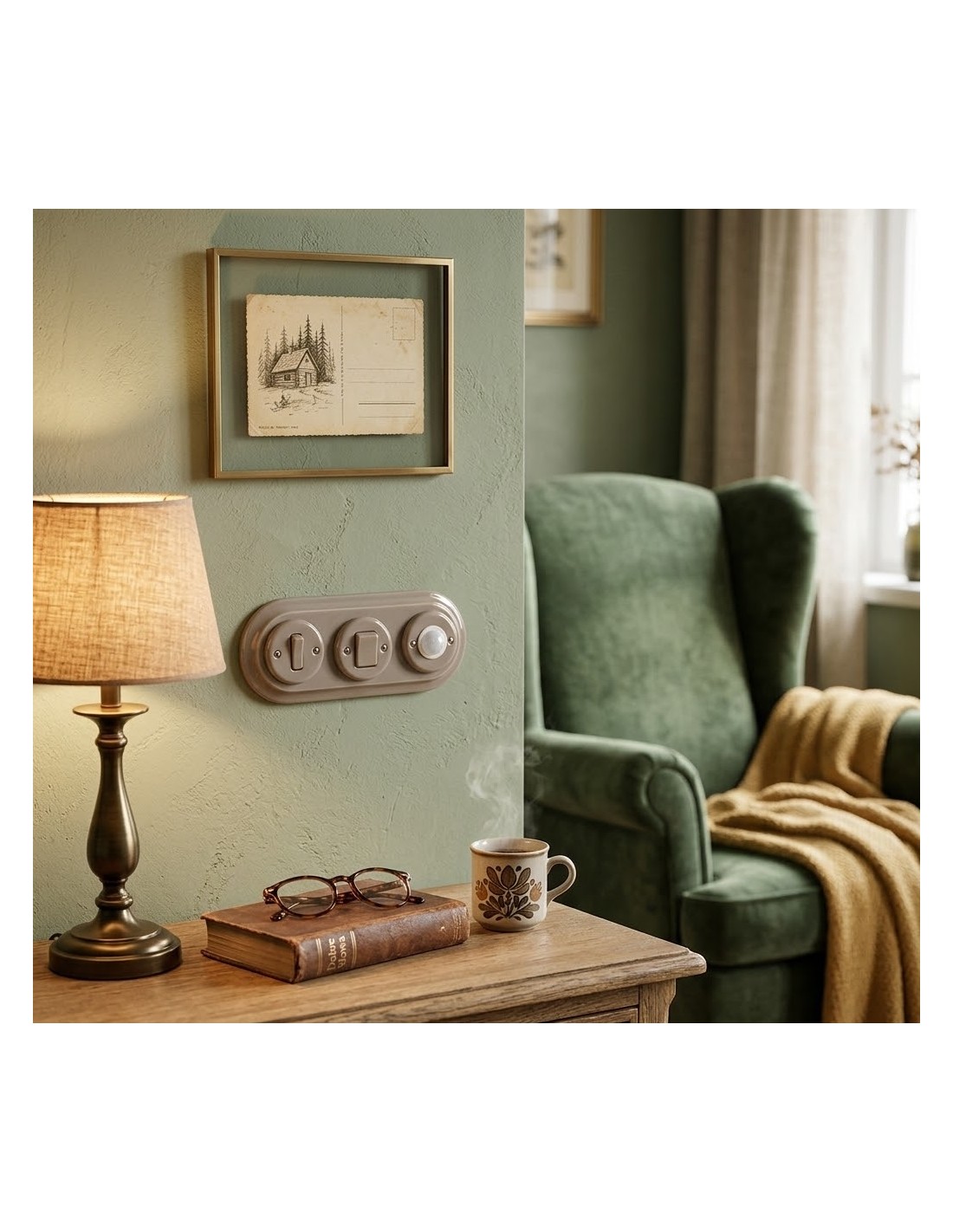 Interruptor de cerámica empotrado de doble tecla color oliva pastel sin marco