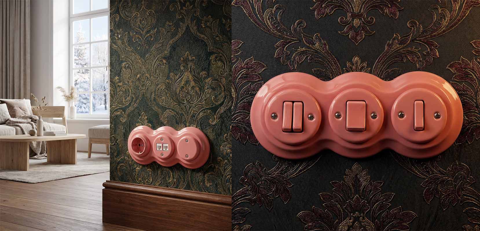 Marka JLM LUX RETRO, to producent ekskluzywnego porcelanowego jak i wykonanego z tworzywa osprzętu elektrycznego 230V, m.in. włączniki i gniazda w wersji natynkowej i podtynkowej, ramki, puszki, uchwyty przewodów, oprawy oświetleniowe, podsufitki, przepusty kablowe, żarówki, przewody w oplotach oraz kinkiety.